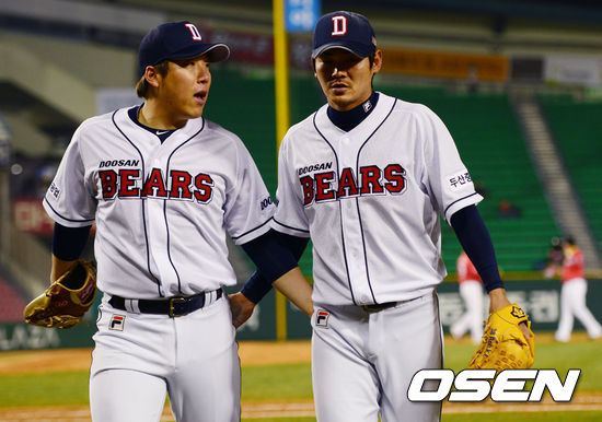 2일 오후 서울 잠실야구장에서 '2013 한국야쿠르트 세븐프로야구' 두산 베어스 대 SK 와이번스의 경기가 열렸다. 5회초 SK 공격을 무실점으로 마무리 지은 두산 선발 노경은과 김현수가 더그아웃으로 들어오며 대화를 나누고 있다.