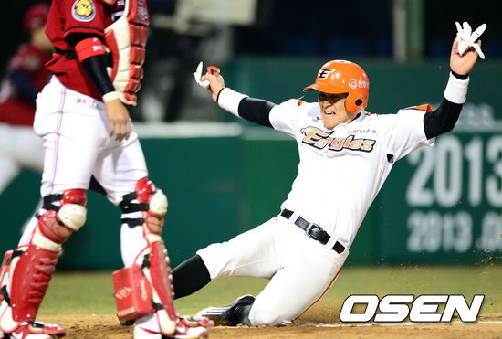 3회말 1사 2,3루 한화 김태균의 희생플라이 때 3루주자 이대수가 홈으로 쇄도해 세이프 되고 있다.