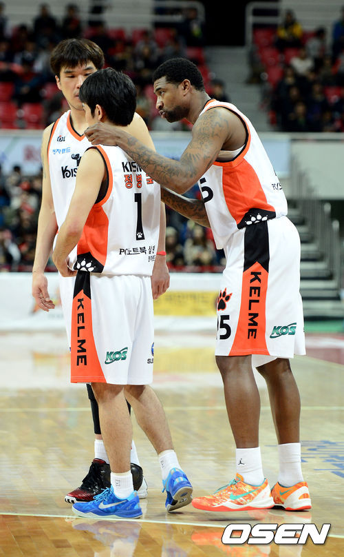 2일 오후 울산 동천체육관에서 열린 'KB 국민카드 2012-2013 프로농구' 4강 플레이오프 1차전 울산 모비스와 인천 전자랜드의 경기 3쿼터 시작전 전자랜드 포웰이 정병국과, 주태수와 이야기를 나누고 있다.