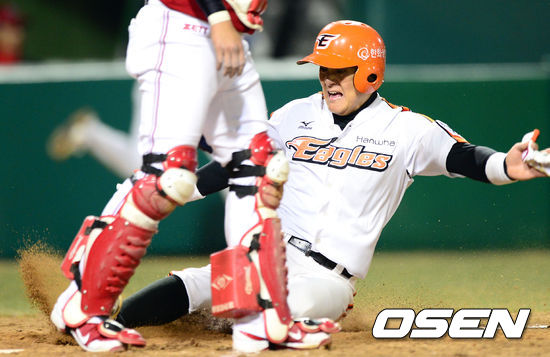 3회말 1사 2,3루 한화 김태균의 희생플라이 때 3루주자 이대수가 홈으로 쇄도해 세이프 되고 있다.