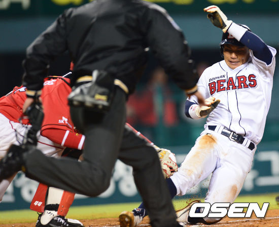 2일 오후 서울 잠실야구장에서 '2013 한국야쿠르트 세븐프로야구' 두산 베어스 대 SK 와이번스의 경기가 열렸다. 5회말 두산 공격 1사 1, 2루 상황 4번 김동주의 좌전안타 때 홈으로 쇄도하던 2루 주자 이종욱이 SK포수 조인성의 태그에 걸려 아웃되고 있다.