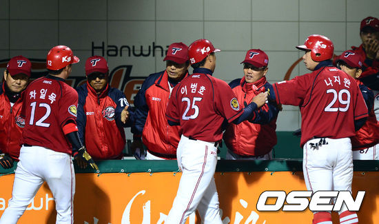 5회초 1사 만루에서 KIA 김주찬의 좌전 2타점 적시타 때 홈을 밟은 차일목과 이범호가 덕아웃에서 동료들의 축하를 받고 있다.