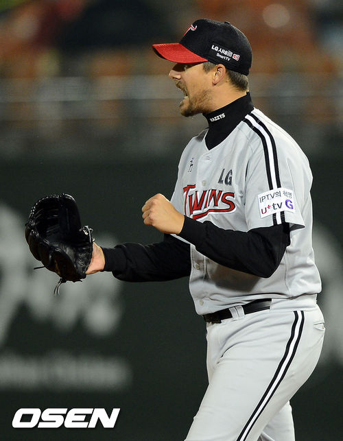 2일 오후 서울 목동구장에서 열린 '2013 한국야쿠르트 세븐 프로야구' 넥센 히어로즈와 LG 트윈스의 경기 7회말 무사 1루 LG 선발투수 주키치가 넥센 강정호를 병살아웃 시킨후 환호하고 있다.