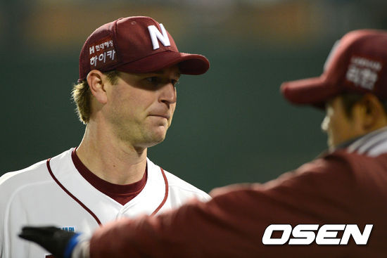 2일 오후 서울 목동구장에서 열린 '2013 한국야쿠르트 세븐 프로야구' 넥센 히어로즈와 LG 트윈스의 경기 6회초 이닝 종료 후 넥센 밴 헤켄 선발투수가 더그아웃으로 들어가고 있다.