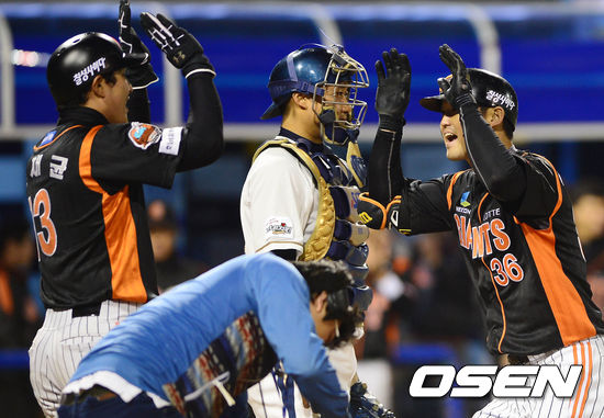 2일 오후 창원 마산구장에서 열린 '2013 한국야쿠르트 세븐 프로야구' NC 다이노스와 롯데 자이언츠의 경기 7회초 무사 3루 박종윤이 투런포를 친 후 황재균과 하이파이브를 하고 있다.