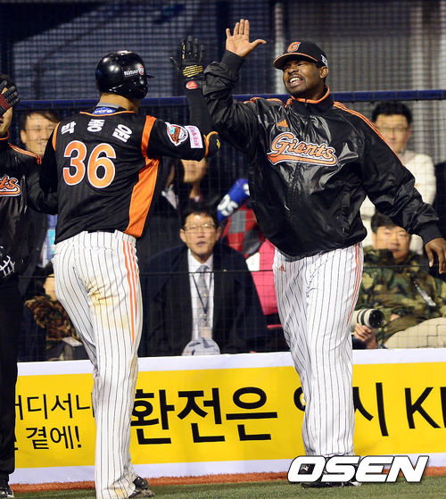 2일 오후 창원 마산구장에서 열린 '2013 한국야쿠르트 세븐 프로야구' NC 다이노스와 롯데 자이언츠의 경기 7회초 무사 3루 박종윤이 투런포를 치고 덕아웃에서 유먼과 하이파이브를 하고 있다.