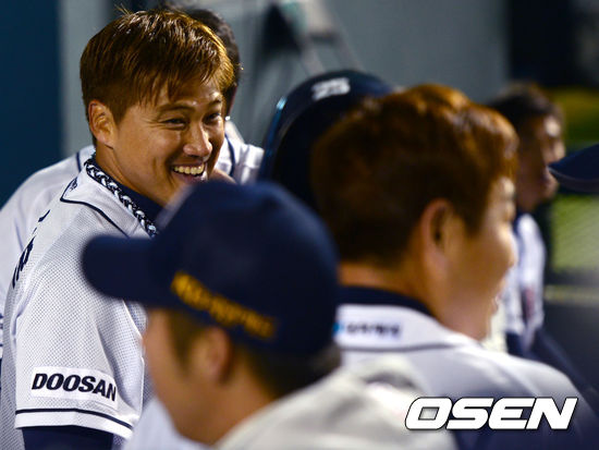 2일 오후 서울 잠실야구장에서 '2013 한국야쿠르트 세븐프로야구' 두산 베어스 대 SK 와이번스의 경기가 열렸다. 5회말 두산 공격 2사 만루 상황에서 대거 6득점에 성공한 두산 더그아웃의 홍성흔이 기뻐하고 있다.