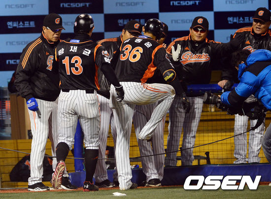 2일 오후 창원 마산구장에서 열린 '2013 한국야쿠르트 세븐 프로야구' NC 다이노스와 롯데 자이언츠의 경기 7회초 무사 3루 박종윤이 투런포를 친 후 덕아웃으로 향하며 방송카메라 케이블을 넘어가고 있다.