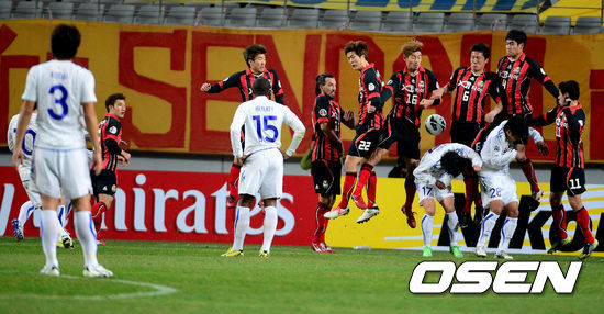 후반 서울 수비진이 센다이 프리킥을 몸으로 막아내고 있다.