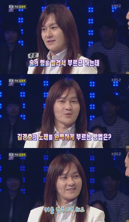 그는 이날 방송에서 "많은 남성 분들이 술의 힘을 빌어 김경호씨의 노래를 부르는데 너무 고음이다. 잘 부르는 방법이 있나"라는 질문에 "많이들 고음을 내는 방법을 물어보신다. 키를 낮춰 부르시면 된다"고 재치있게 답해 현장을 폭소케 했다.