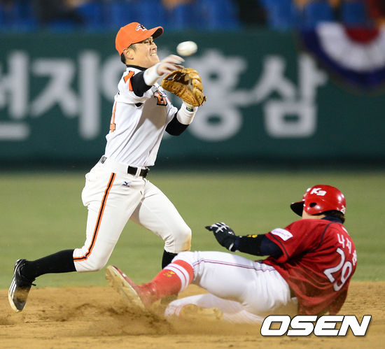 7회초 1사 만루 KIA 최희섭의 땅볼 타구를 잡은 한화 이대수가 1루주자 나지완을 포스 아웃 처리하고 있다.