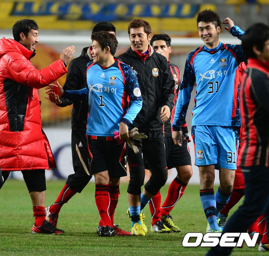 후반 유상훈의 퇴장으로 골키퍼를 맡은 최현태가 경기후 동료선수들의 격려를 받고 있다./jpnews@osen.co.kr