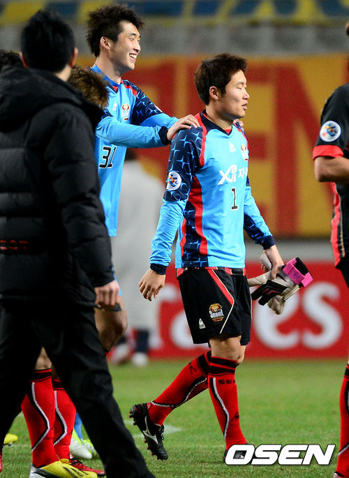 후반 유상훈의 퇴장으로 골키퍼를 맡은 최현태가 경기후 유상훈의 격려를 받으며 그라운드를 나서고 있다. /jpnews@osen.co.kr