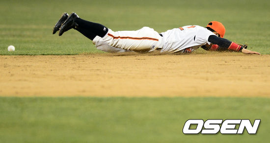 7회초 무사 1루에서 한화 조정원이 KIA 이용규의 타구를 놓치고 있다.