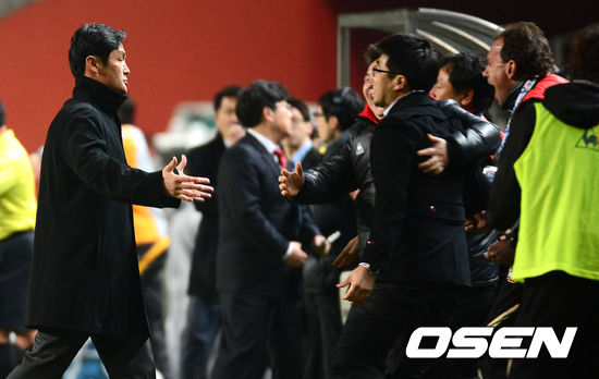 경기후 최용수 감독이 코칭스태프와 승리를 기뻐하고 있다./jpnews@osen.co.kr