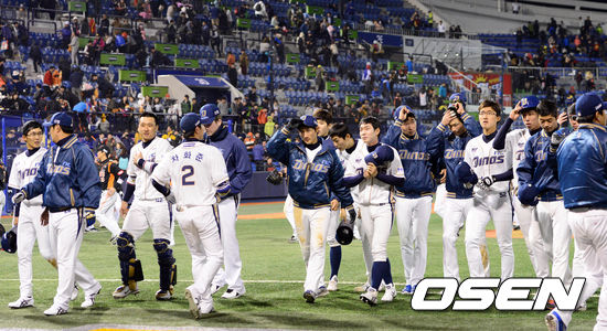 2일 오후 창원 마산구장에서 열린 '2013 한국야쿠르트 세븐 프로야구' NC 다이노스와 롯데 자이언츠의 경기 종료 후 NC 선수들이 관중들에게 인사를 하고 있다.