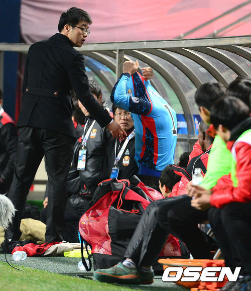 교체카드를 다 쓴 서울이 후반 골키퍼 유상훈의 퇴장으로 수비수 최현태가 골키퍼를 맡자 김용대가 유니폼을 벗어주고 있다./jpnews@osen.co.kr