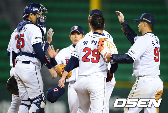 승리한 두산 선수들이 하이파이브를 나누고 있다./ dreamer@osen.co.kr