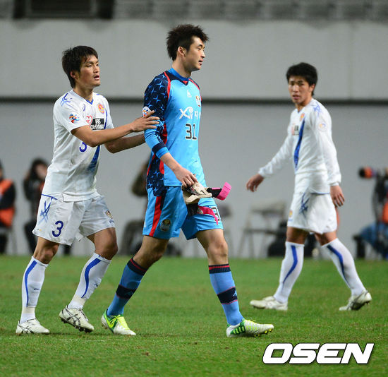 후반 유상훈이 퇴장당하자 센다이 고다이가 유상훈에 빨리 그라운드를 나가라며 밀고 있다./jpnews@osen.co.kr