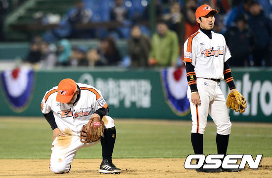 9회초 1사 만루 KIA 최희섭의 내야안타 때 실책으로 KIA에게 2점을 허용한 한화 김태균과 한상훈이 아쉬운 표정을 짓고 있다.