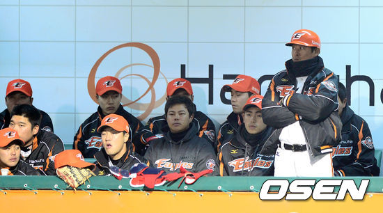 9회초 한화 이종범 코치를 비롯한 선수들이 경기를 지켜보고 있다.