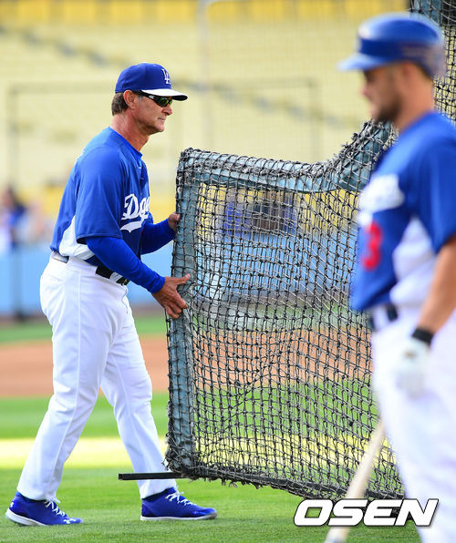 3일 오전(이상 한국시간) 미국 캘리포니아 로스앤젤레스 다저스타디움에서 LA 다저스와 샌프란시스코 자이언츠의 경기가 열릴 예정인 가운데 훈련 시간에 LA 다저스 돈 매팅리 감독이 그물망을 옮기고 있다.