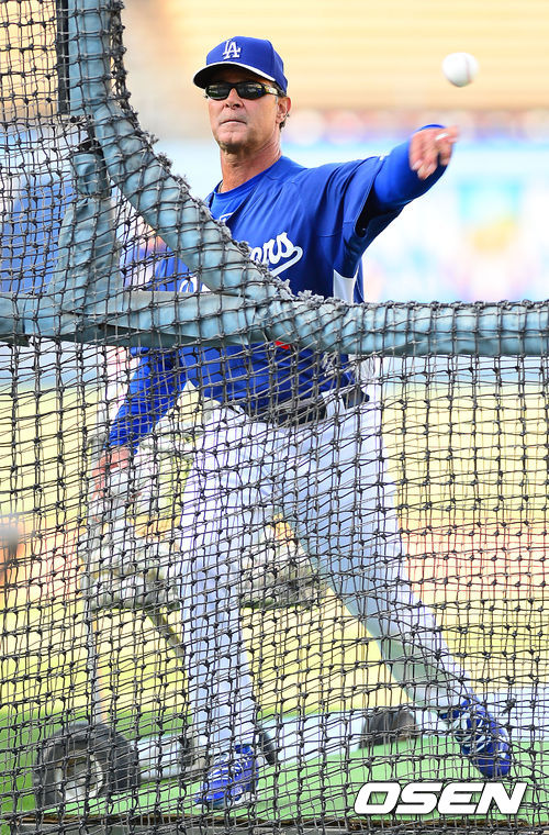 3일 오전(이상 한국시간) 미국 캘리포니아 로스앤젤레스 다저스타디움에서 LA 다저스와 샌프란시스코 자이언츠의 경기가 열릴 예정인 가운데 훈련 시간에 LA 다저스 돈 매팅리 감독이 배팅볼을 던져주고 있다.