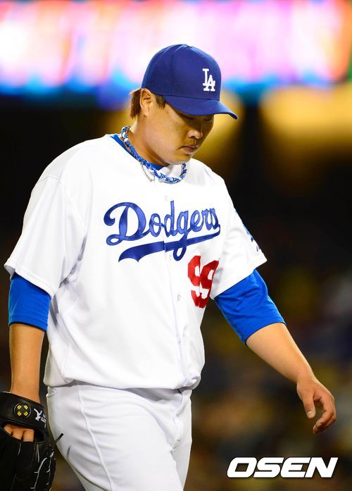 4회초 연속안타로 1실점 한 류현진이 아쉬운 표정으로 이닝을 마치고 더그아웃으로 가고 있다.