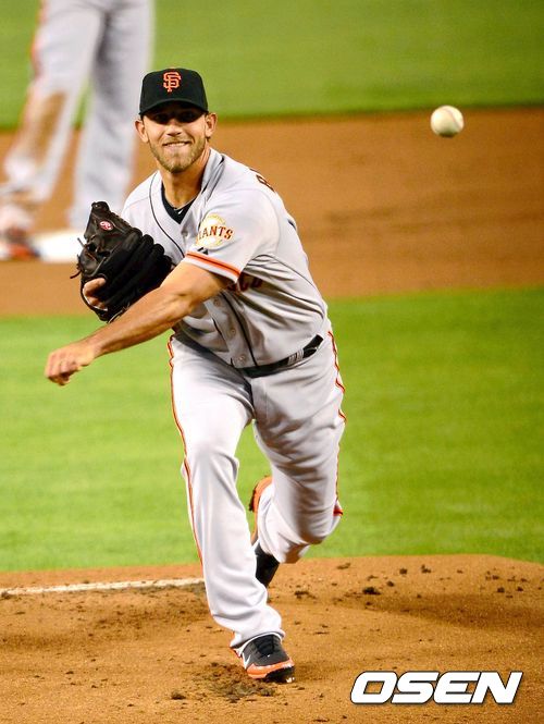 류현진의 메이저리그 첫 상대 매디슨 범가너가 힘차게 공을 던지고 있다.