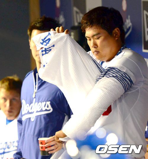 4회초 류현진이 덕아웃에서 팔을 타올로 감싸고 있다.