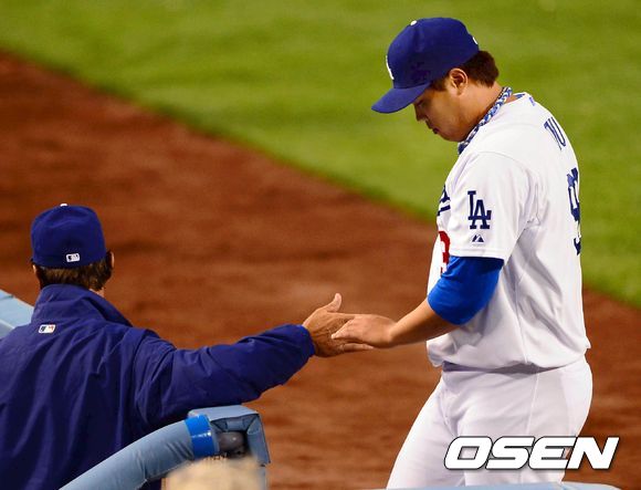 류현진이 1회초를 무실점으로 막고 더그아웃으로 가고 있다.
