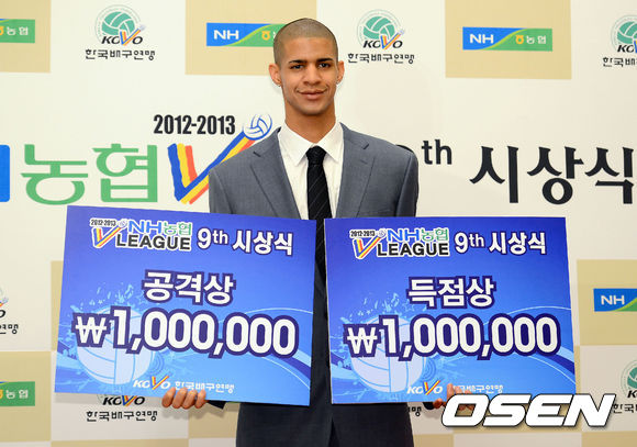공격상과 득점상을 받은 레오가 포토타임을 갖고 있다.