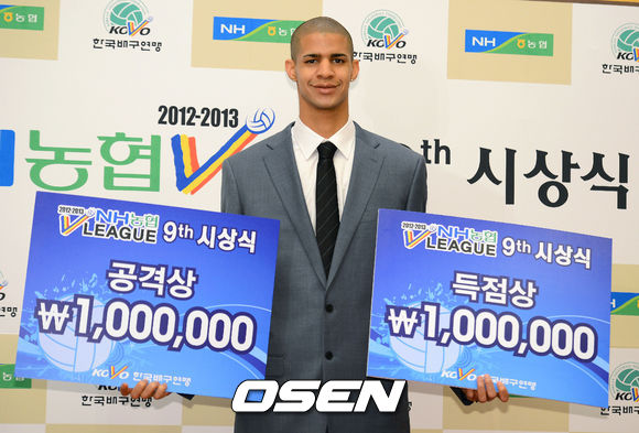 공격상과 득점상을 받은 레오가 포토타임을 갖고 있다.