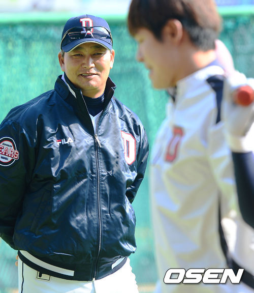 3일 오후 서울 잠실야구장에서 열리는 '2013 한국야쿠르트 세븐 프로야구' 두산 베어스 대 SK 와이번스의 경기를 앞두고 두산 김진욱 감독이 선수들의 훈련을 지켜 본 뒤 덕아웃으로 들어오고 있다.