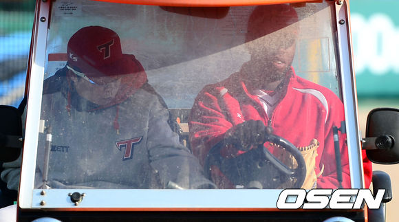 경기에 앞서 KIA 나지완과 소사가 카트 운전석에 앉아 내부를 살피고 있다.