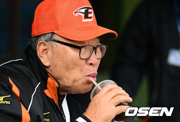 경기에 앞서 한화 김응룡 감독이 덕아웃에서 커피를 마시고 있다.