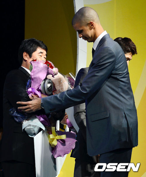 감독상을 수상한 신치용감독에게 레오가 축하 꽃다발을 건네고 있다.