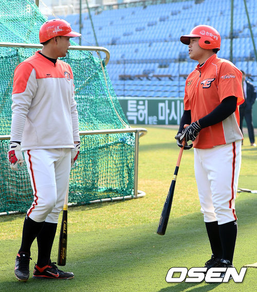 경기에 앞서 한화 김태완과 최진행이 타격 훈련 중 이야기를 나누고 있다.
