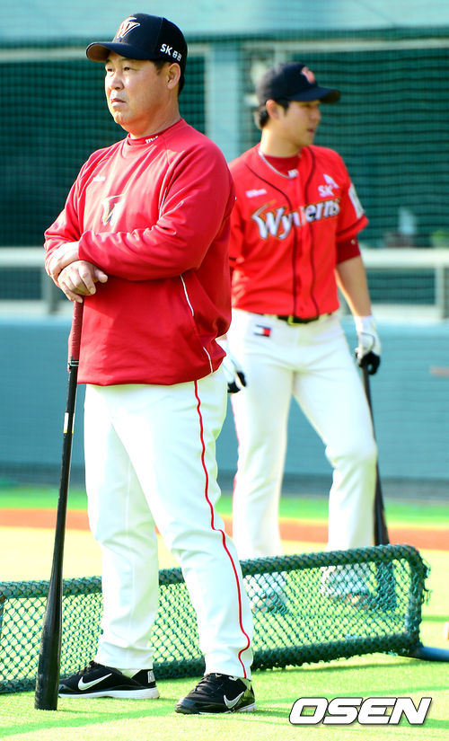 3일 오후 서울 잠실야구장에서 열리는 '2013 한국야쿠르트 세븐 프로야구' 두산 베어스 대 SK 와이번스의 경기를 앞두고 SK 이만수 감독이 선수들의 훈련을 지켜보고 있다.