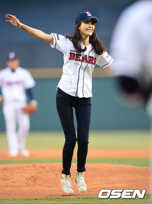 3일 오후 서울 잠실야구장에서 '2013 한국야쿠르트 세븐 프로야구' 두산 베어스 대 SK 와이번스의 경기가 열렸다. 배우 채정안이 시구자로 나서 공을 던진 뒤 팔짝 뛰며 좋아하고 있다.
