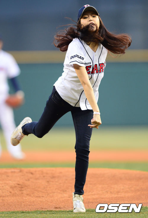 3일 오후 서울 잠실야구장에서 '2013 한국야쿠르트 세븐 프로야구' 두산 베어스 대 SK 와이번스의 경기가 열렸다. 배우 채정안이 시구자로 나서 힘차게 공을 던지고 있다.