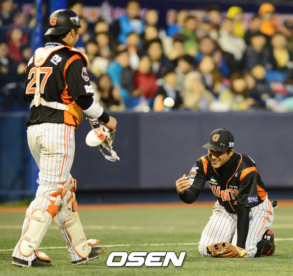 3일 오후 창원 마산구장에서 열린 '2013 한국야쿠르트 세븐 프로야구' NC 다이노스와 롯데 자이언츠의 경기 2회말 선두타자 권희동의 뜬공을 잡은 황재균이 볼을 용덕한에게 건내고 있다.