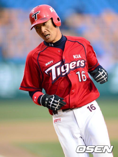 1회초 1사 2루에서 KIA 이범호의 우전 적시타 때 2루주자 김주찬이 홈을 밟고 있다.