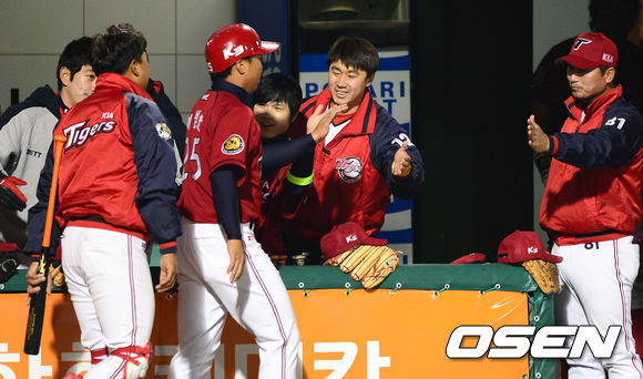 3회초 2사 1,3루에서 KIA 안치홍의 좌전 적시타 때 홈을 밟은 3루주자 이범호가 덕아웃에서 동료들의 축하를 받 있다.