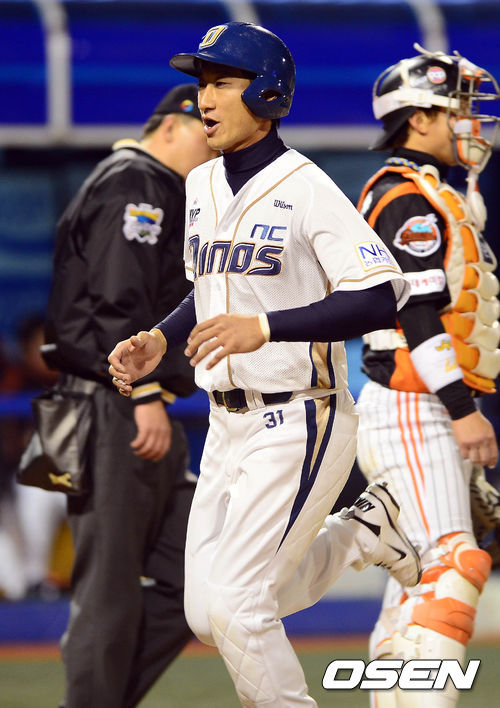 3일 오후 창원 마산구장에서 열린 '2013 한국야쿠르트 세븐 프로야구' NC 다이노스와 롯데 자이언츠의 경기 5회말 1사 3루 김태군의 1타점 적시타에 홈을 밟은 3루주자 이현곤이 홈을 밟고 있다.