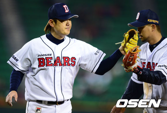 3일 오후 서울 잠실야구장에서 '2013 한국야쿠르트 세븐 프로야구' 두산 베어스 대 SK 와이번스의 경기가 열렸다. 3회초 SK 공격을 무실점으로 마무리지은 두산 선발 김선우와 1루수 오재원이 인사를 나누고 있다.