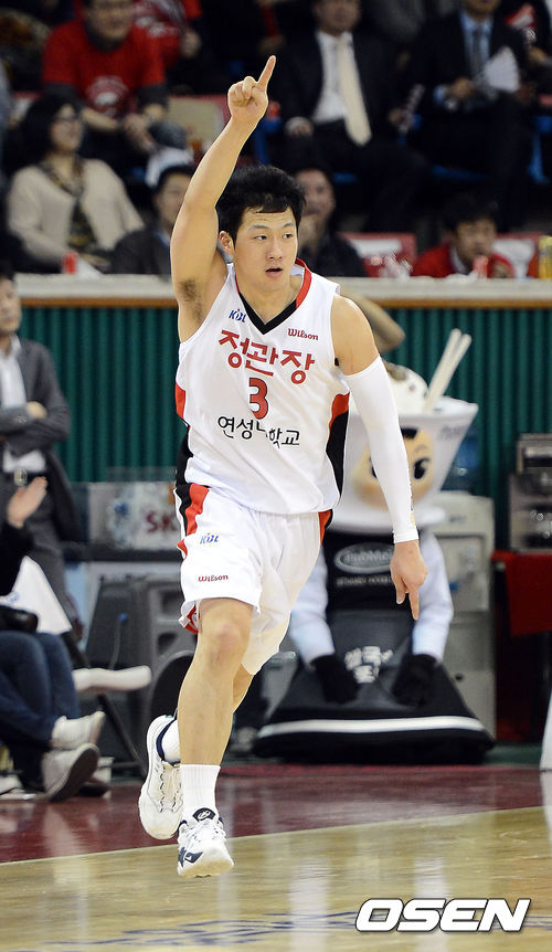 3일 오후 잠실학생체육관에서 열린 '2012-2013 KB국민카드 프로농구 4강 PO 2차전' 서울 SK와 안양 KGC의 경기 2쿼터 KGC 이정현이 3점슛을 성공시킨 뒤 기뻐하고 있다.
