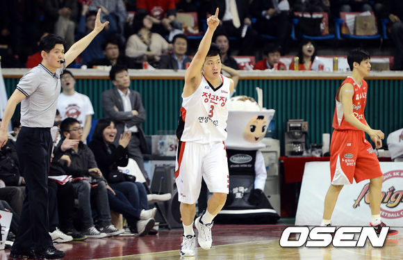 3일 오후 잠실학생체육관에서 열린 '2012-2013 KB국민카드 프로농구 4강 PO 2차전' 서울 SK와 안양 KGC의 경기 2쿼터 KGC 이정현이 역전 3점슛을 성공시킨 뒤 기뻐하고 있다.