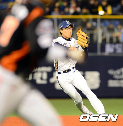 3일 오후 창원 마산구장에서 열린 '2013 한국야쿠르트 세븐 프로야구' NC 다이노스와 롯데 자이언츠의 경기 7회초 1사 1루 용덕한의 땅볼을 노진혁이 1루로 송구 아웃시키고 있다.