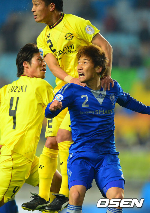 3일 오후 경기도 수원시 수원월드컵경기장에서 열린 2013 아시아축구연맹(AFC) 챔피언스리그 H조 수원 삼성과 가시와 레이솔의 경기 전반 수원 최재수가 가시와 수비수와 공중볼을 다투고 있다